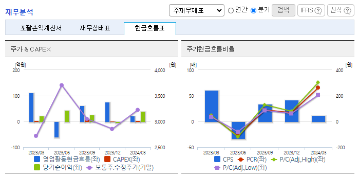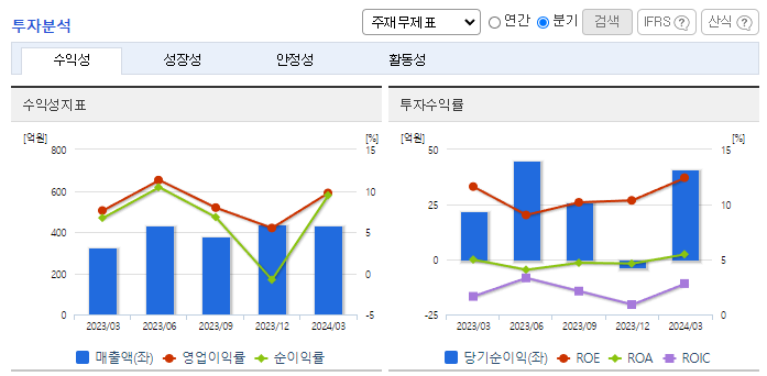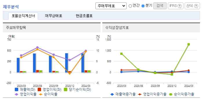 -2024년 3월 전년동기 대비 연결기준 매출액은 31.5% 증가, 영업이익은 68.4% 증가, 당기순이익은 85.4% 증가. 선박용 크레인의 매출이 작년 동기 대비 40억 가량 상승, 거주구 연돌 매출이 60억 이상 상승하며 매출 성장세를 견인. 동사의 주력 구조물 상품인 데크하우스의 수주 잔고가 900억 가량. 올해 실적으로 반영될 예정. 전방 산업의 LNG선 수주가 24년 반영될 예정.