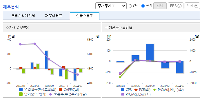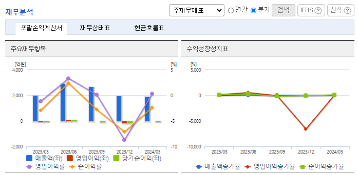 -2024년 3월 전년동기 대비 연결기준 매출액은 5.3% 감소, 영업이익 흑자전환, 당기순손실은 30.9% 감소. 매출액은 감소하였지만 가격경쟁력 확보를 위한 원가절감활동 진행으로 영업이익 흑자전환을 보여주었으며, 주요 국가 거래처들과 해외시장 진출을 위해 MOU를 체결하여 당기순이익 증가함. 전 세계 180여 국의 캐리어 해외 네트워크를 활용해 해외 시장을 공략하고 향후 그룹 매출액 중 해외 비중을 50%까지 끌어올릴 방침임.