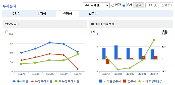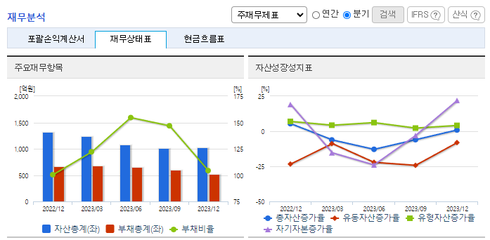 -2023년 9월 전년동기 대비 연결기준 매출액은 24% 감소, 영업손실은 25.7% 증가, 당기순손실은 7.7% 감소. 매출은 감소했지만 판관비는 오히려 8.5% 증가하면서 수익성에 악영향을 줌. 판관비에서 인건비 및 복리후생비가 20.1% 증가하며 영업이익 부담을 줌. 영업 외 손익에서 이자수익과 파생상품평가이익이 포함된 금융수익이 340.10% 증가하며 당기순손실에 긍정적인 영향을 줌.