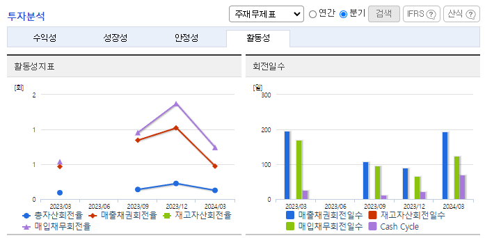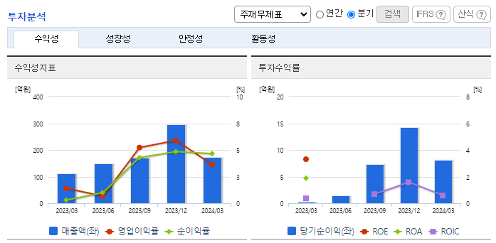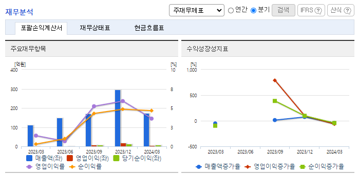 -2024년 3월 전년동기 대비 연결기준 매출액은 56.4% 증가, 영업이익은 304.8% 증가, 당기순이익은 2,360.5% 증가. 기존 사업 중 통신시설구축 관련 매출 증가, 엔터테인먼트 및 관련 서비스업을 영위하는 비케이앤미디어(주)의 연결로 외형 성장이 두드러졌고 손익도 크게 개선됨. 경쟁 구도를 탈피한 새로운 영역을 창출, IOT, C-ITS등과 연계된 새로운 성장동력을 발굴하여 5G 매출 감소 영향을 최소화 추진 계획.