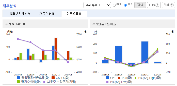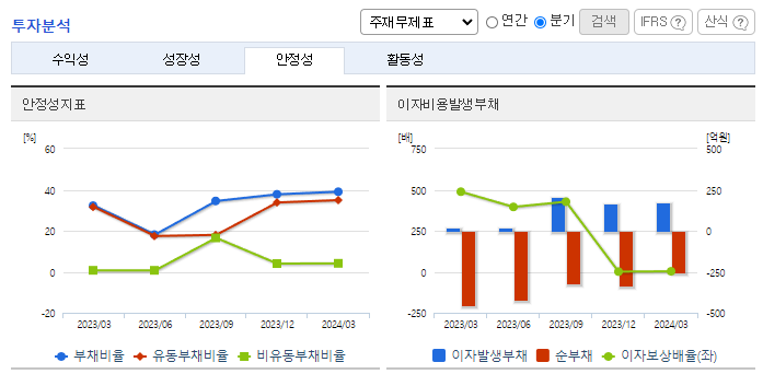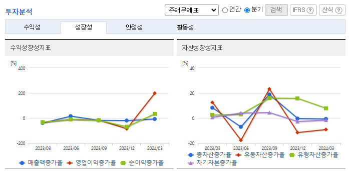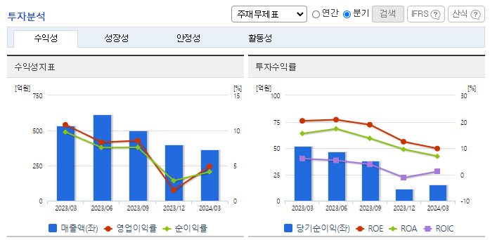 -2024년 3월 전년동기 대비 연결기준 매출액은 31.3% 감소, 영업이익은 68.9% 감소, 당기순이익은 63.1% 감소. 디스플레이 제조설비 유지보수를 하는 용역 사업 부문이 75.21% 감소하면서 전체 외형성장에 악영향을 줌. 디스플레이소재 사업 부문은 53.09%, 반도체 및 디스플레이부품 사업 부문은 49.65% 증가했지만, 전년 동기 가장 큰 비중을 차지한 용역 매출이 크게 감소하여 전체 매출이 감소함.