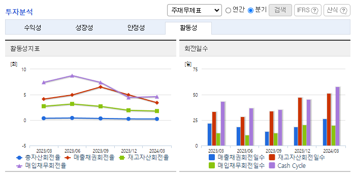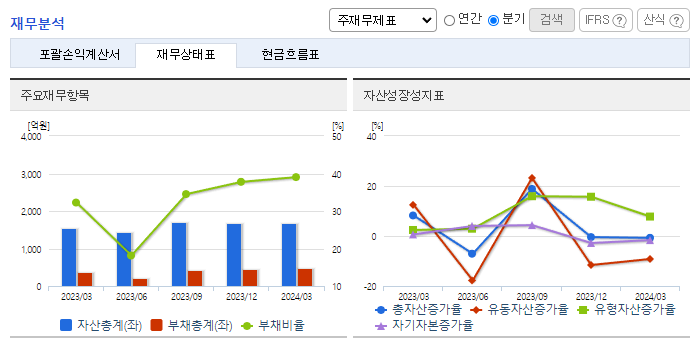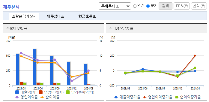 -2024년 3월 전년동기 대비 연결기준 매출액은 31.3% 감소, 영업이익은 68.9% 감소, 당기순이익은 63.1% 감소. 디스플레이 제조설비 유지보수를 하는 용역 사업 부문이 75.21% 감소하면서 전체 외형성장에 악영향을 줌. 디스플레이소재 사업 부문은 53.09%, 반도체 및 디스플레이부품 사업 부문은 49.65% 증가했지만, 전년 동기 가장 큰 비중을 차지한 용역 매출이 크게 감소하여 전체 매출이 감소함.