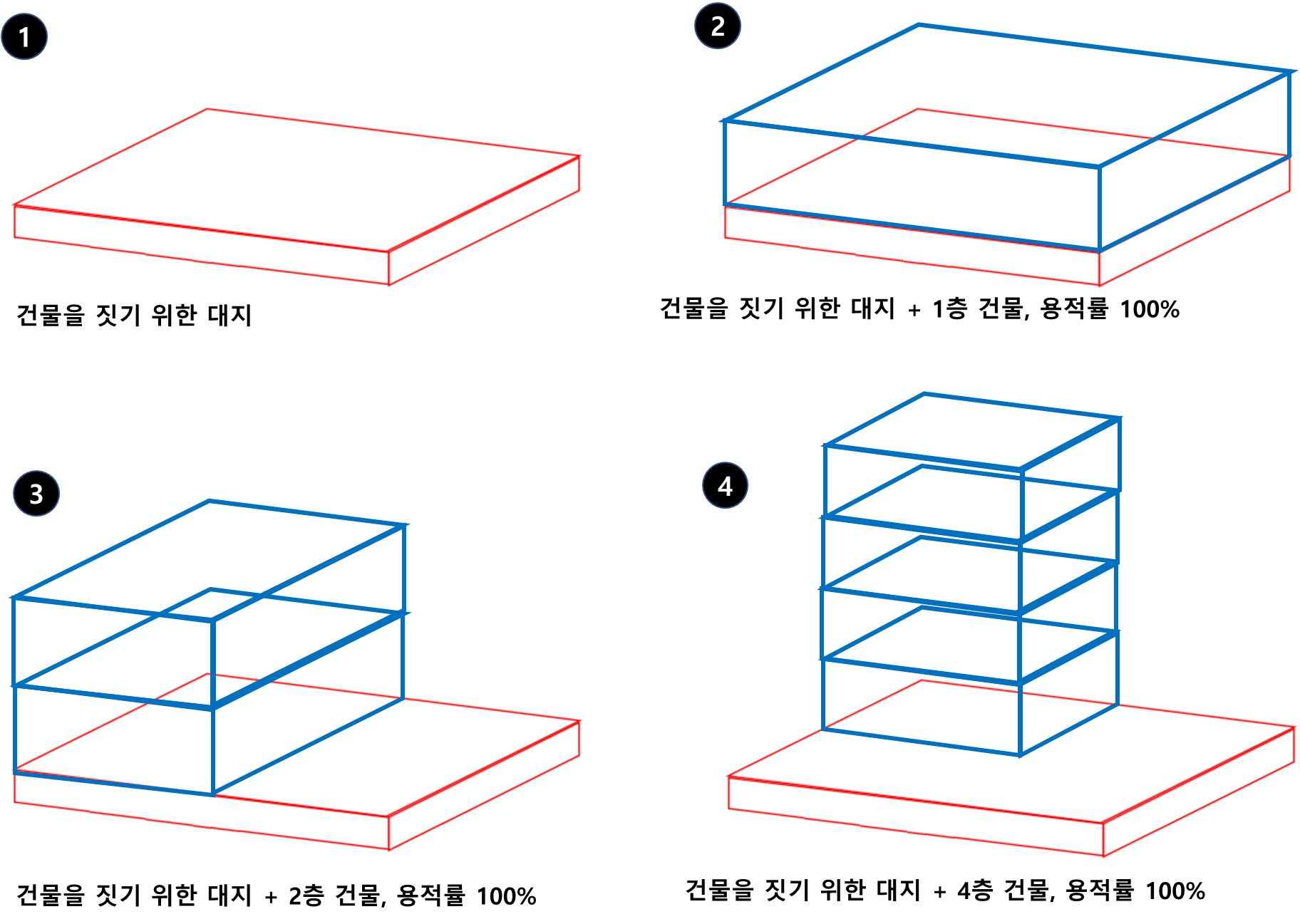용적률 = 건물의 총 대지면적 / 건물을 짓기 위한 대지면적 이다. (x100(%))