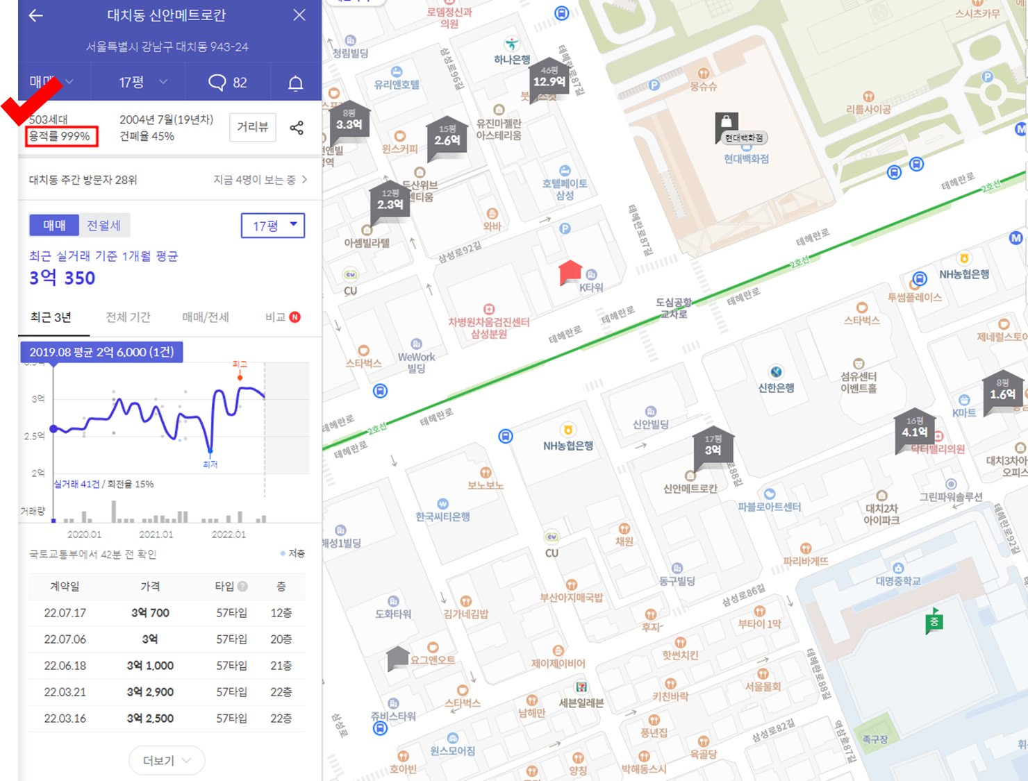 강남구 대치동에 있는 신안메트로칸 건물의 경우 용적률이 999%로 매우 고층 건물임을 알 수 있다.