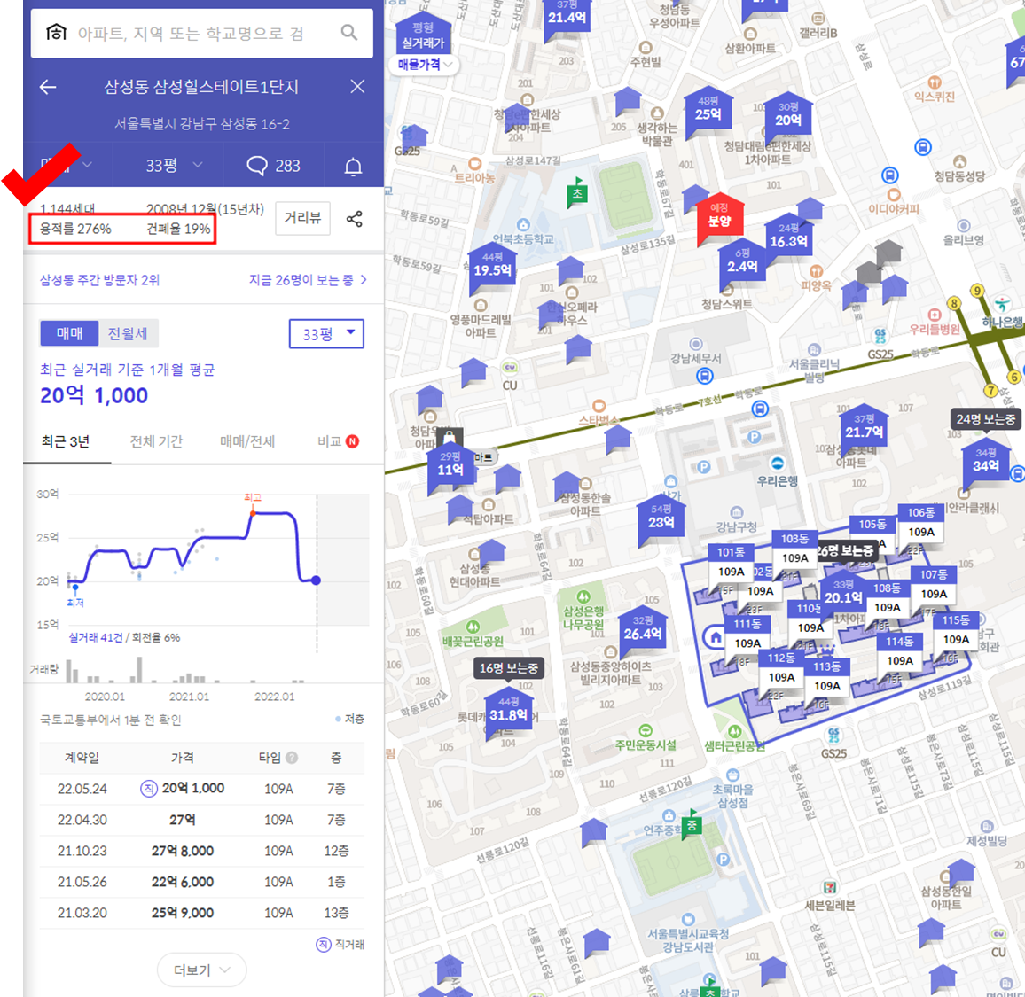 위 캡쳐본은 삼성동 삼성힐스테이트 1단지 아파트의 용적률과 건폐율을 확인한 정보이다.