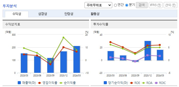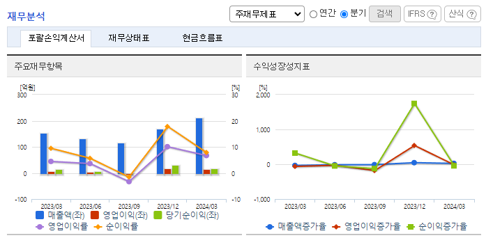 -2024년 3월 전년동기 대비 연결기준 매출액은 37.2% 증가, 영업이익은 107.2% 증가, 당기순이익은 14% 증가. 동사의 전체 매출액 중 약 70%를 차지하는 산업용 감속기 매출이 전년동기 대비 158 % 증가하여 전체 매출액 증가에 긍정적인 영향을 주었음. 제철설비 분야의 열연. 냉연. 제강라인의 핵심설비를 턴키(Turnkey) 방식으로 생산하여 사업영역을 확장하고 있음.