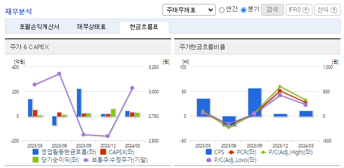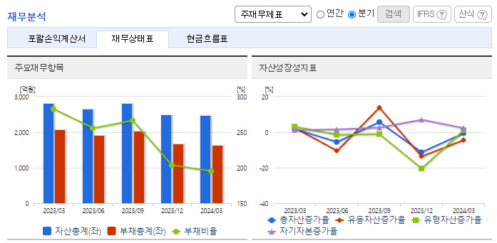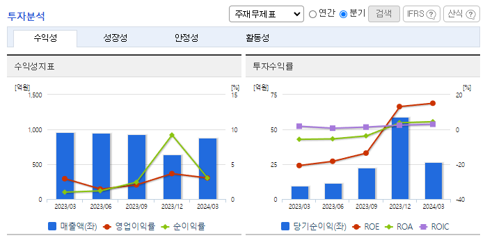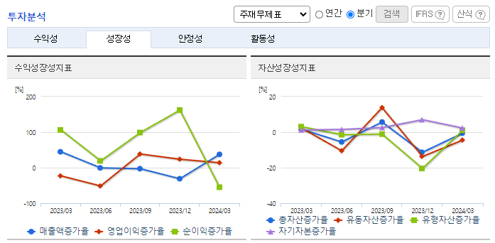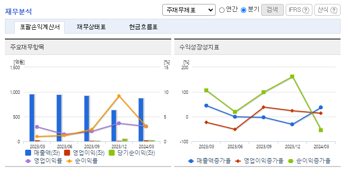 -2024년 3월 전년동기 대비 연결기준 매출액은 0.4% 증가, 영업이익은 9.5% 감소, 당기순이익은 180.2% 증가. 주요 고객사의 대표모델, 중대형 SUV 등을 중심으로 판매를 늘린 매출액은 전년동기 수준을 유지했으며, 영업이익은 역성장함. 전기차 관련 부품이 하반기부터 본격적으로 매출에 인식되기 시작할 것이며, 매출 성장 속도가 개선될 가능성을 기대해 봄.