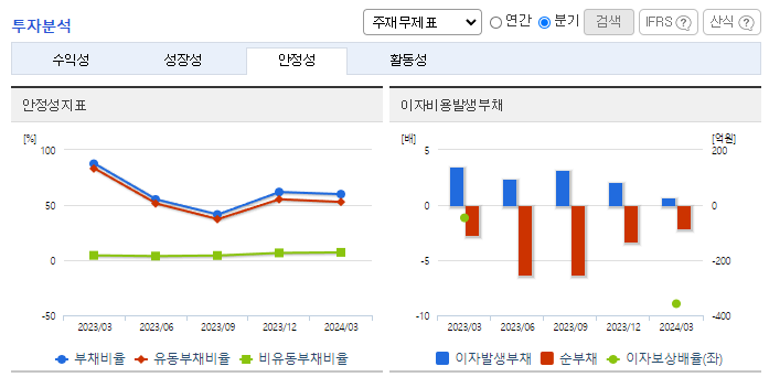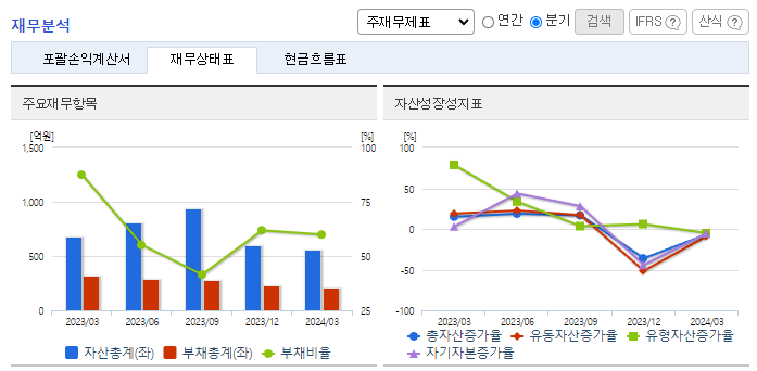 -2024년 3월 전년동기 대비 연결기준 매출액은 3.3% 증가, 영업손실은 316.7% 증가, 당기순손실은 286.1% 증가. 매출액이 소폭 증가한데 반해 지급수수료와 같은 비용이 급증하여 동사의 2024년 영업손실폭이 급증. 유가증권시장상장규정 제48조에 따른 상장폐지 사유에 해당되어 2024년 04월 05일 동사에 상장폐지사유가 동사에 통보되었고 현재 '개선기간 부여'됨.