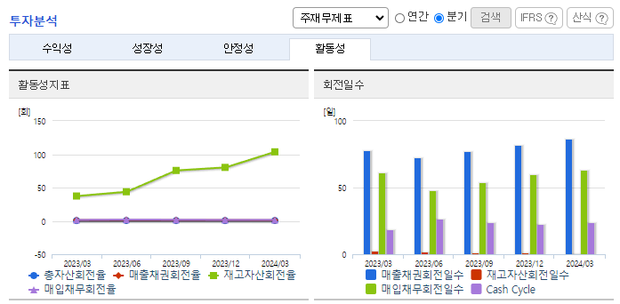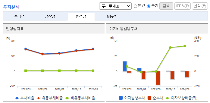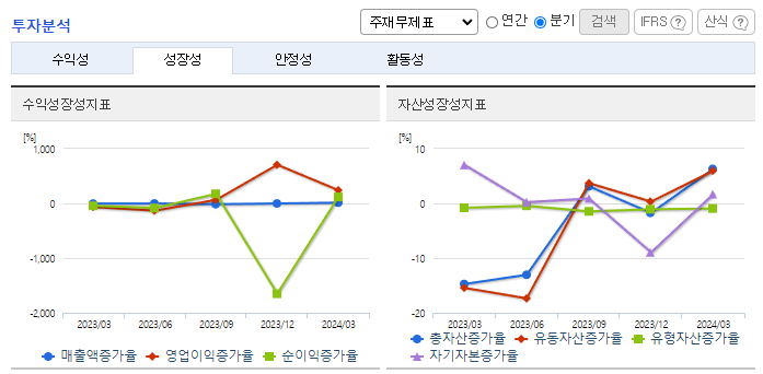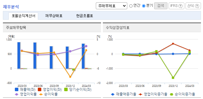 -2024년 3월 전년동기 대비 연결기준 매출액은 5.5% 감소, 영업이익은 132.3% 증가, 당기순이익은 22.9% 증가. 전년동기 대비 매출이 소폭 하락했음에도 원자재 가격이 크게 안정화되며 원가율이 하락했고 이에 따라 영업이익은 증가함. PF우려 등에도 무난한 분양률을 보이고 있으며 에코프로머티와 423억 규모의 결정화 공급 설비 계약을 맺는 등 외형 성장과 안정적인 사업 유지를 위한 노력을 계속해가고 있음.