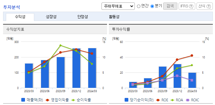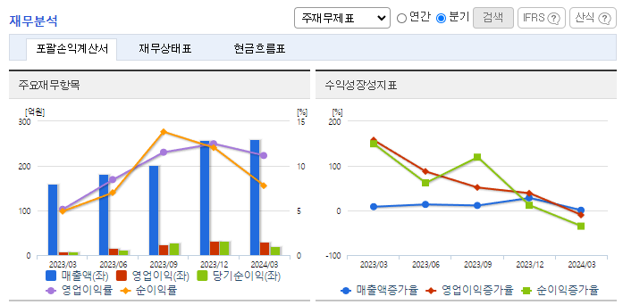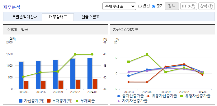 -2024년 3월 전년동기 대비 별도기준 매출액은 62.8% 증가, 영업이익은 254.2% 증가, 당기순이익은 157.5% 증가. 순환기용제에 강점을 갖고 있으며, 당 분기 매출액의 약 27% 이상 시현함. 주요 제품인 고지혈증 치료제(아토렌정)는 매출액 1,203백만 원 달성함. 노인성 질환과 관련한 의약품 라인업 확대를 위해 개량신약에 대한 연구개발계획을 수립하였으며, 준비 중인 개량신약에 대한 특허 연계와 제품 라인업 강화 예정.