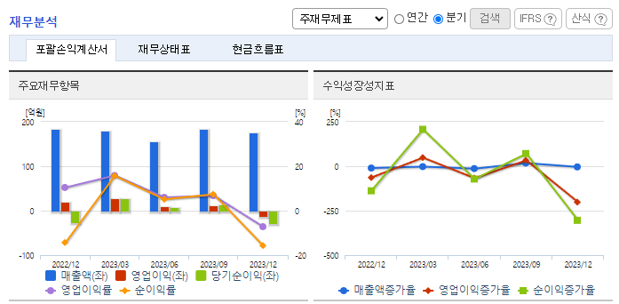 -2023년 9월 전년동기 대비 연결기준 매출액은 23.2% 감소, 영업이익은 78.4% 감소, 당기순이익은 74.3% 감소. 매출액이 23% 감소했으며, 게임 개발자 인건비 상승으로 인한 인건비 상승폭이 15%를 넘어서며 영업이익도 80%가까이 감소함. 동사는 블록체인 게임시장 개척, 지속적인 게임개발을 통한 신작 출시, IP(지식재산권) 활용사업 확대와 사업 관련 전략적 투자 등을 적극 추진하여 꾸준한 성장을 도모하고 있음.