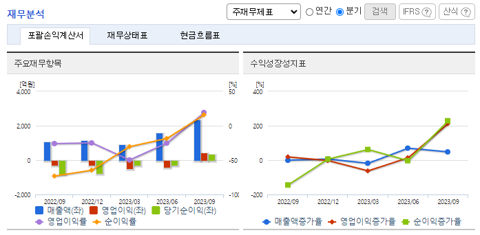 -2023년 9월 전년동기 대비 연결기준 매출액은 40.3% 증가, 영업손실은 25.7% 감소, 당기순손실은 84.9% 감소. 신작 나이트 크로우의 활약에 힘입어 매출액이 40% 가량 증가했고 이에 따라 전년동기 대비 영업손실폭과 당기순손실 폭이 감소함. IP 사업의 핵심이 되는 '미르의 전설' IP에 대한 가치를 지속해 가고자 중국 파트너사들과 게임뿐만 아니라 다른 장르 콘텐츠로의 확장을 지속해 나가고 있음.