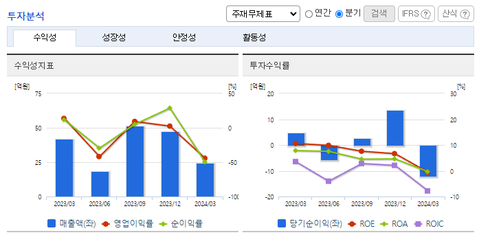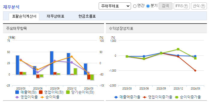 -2024년 3월 전년동기 대비 별도기준 매출액은 42.2% 감소, 영업이익 적자전환, 당기순이익 적자전환. 매출 감소와 더불어 급여와 지급수수료 증가로 영업이익은 -10.7억 시현함. MLCC 등 마이크로칩 부문과 유지보수 매출이 크게 감소한 것이 원인. 머신비전 검사장비 특성상, 한 라인에 복수 업체의 검사장비 사용이 어려워, 동사는 칩 외관검사기, 디스플레이 BONDER 라인검사기, 필름검사기는 각 고객사에 단독으로 공급 중임.
