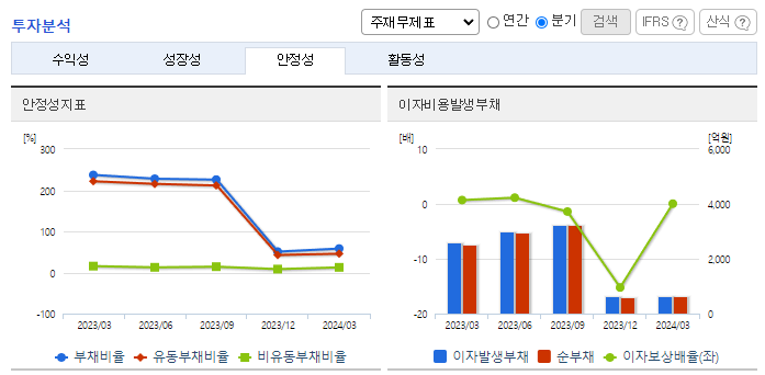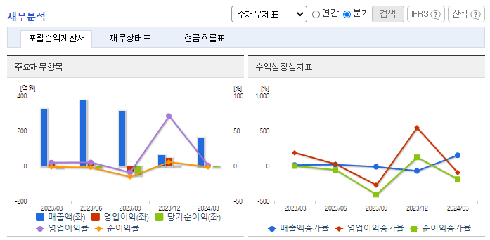 -2023년 12월 전년동기 대비 별도기준 매출액은 8.5% 증가, 영업이익은 14.3% 증가, 당기순이익 적자전환. 매출액이 8.5% 가까이 성장하면서 매출원가, 판관비, 인건비 등의 상승세를 상쇄했고, 이 효과로 영업이익은 10% 넘게 성장하는 효과를 거둠. 주요 종속기업 (주)유니원이 당기 중 매각되면서 계속사업이익은 19억 원, 중단사업손실 81억 원이 계상됨. 이로 인해 당기순이익 적자전환함.