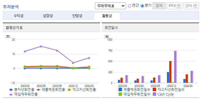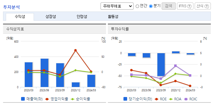 -2023년 12월 전년동기 대비 별도기준 매출액은 8.5% 증가, 영업이익은 14.3% 증가, 당기순이익 적자전환. 매출액이 8.5% 가까이 성장하면서 매출원가, 판관비, 인건비 등의 상승세를 상쇄했고, 이 효과로 영업이익은 10% 넘게 성장하는 효과를 거둠. 주요 종속기업 (주)유니원이 당기 중 매각되면서 계속사업이익은 19억 원, 중단사업손실 81억 원이 계상됨. 이로 인해 당기순이익 적자전환함.