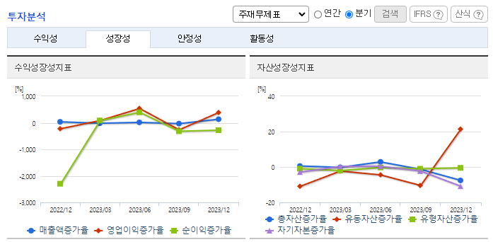 -2023년 9월 전년동기 대비 연결기준 매출액은 11.6% 증가, 영업손실은 154.1% 증가, 당기순이익 적자전환. 매출은 증가하면서 매출원가도 13.5% 증가함. 인건비 및 복리후생비가 -57.7%로 부담을 줄여줬으나 판관비 중 가장 큰 비중을 차지하는 경상연구개발비가 58.89% 증가하며 악영향을 줌. 영업 외 손익에서 기타 손실이 94.65% 증가하며 당기순이익에 부담을 줌. 특히 기부금이 2배 가까이 증가함.
