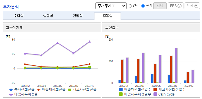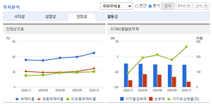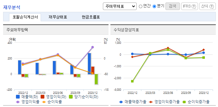 -2023년 9월 전년동기 대비 연결기준 매출액은 11.6% 증가, 영업손실은 154.1% 증가, 당기순이익 적자전환. 매출은 증가하면서 매출원가도 13.5% 증가함. 인건비 및 복리후생비가 -57.7%로 부담을 줄여줬으나 판관비 중 가장 큰 비중을 차지하는 경상연구개발비가 58.89% 증가하며 악영향을 줌. 영업 외 손익에서 기타 손실이 94.65% 증가하며 당기순이익에 부담을 줌. 특히 기부금이 2배 가까이 증가함.