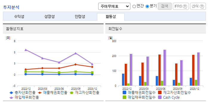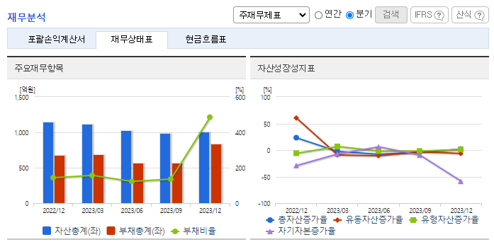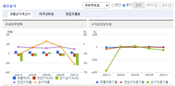 -2023년 9월 전년동기 대비 연결기준 매출액은 51.6% 감소, 영업손실은 9664.7% 증가, 당기순이익 적자전환. 매출액은 감소했지만 판매비와 관리비가 63% 증가함. 특히 판관비 중 가장 큰 비중을 차지하는 인건비가 전년동기 대비 30억 증가하며 수익성을 악화시킴. C/W 탑재수량이 기존 5개에서 3개로 감소하였고, 경기침제에 따른 모바일 시장 판매위축으로 어려움이 예상됨.