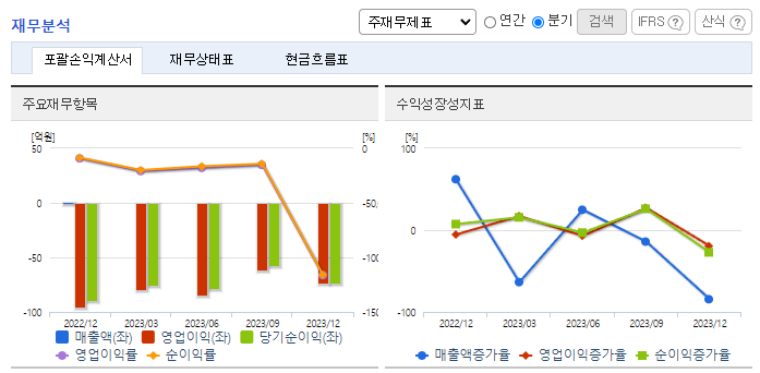 -2023년 12월 전년동기 대비 연결기준 매출액은 38.9% 감소, 영업손실은 18.9% 감소, 당기순손실은 17.1% 감소. 바이오 업황의 하락 및 침체 등으로 인해 당기 중 신규 기술매출은 발생하지 않았으나 시장성이 높은 비임상 관련 용역서비스 사업 및 검체분석 서비스 분야를 확대했음. 항체치료제 EU103은 2023년 1월 2일 국내 1상 임상 IND 신청 후 3월 13일 식품의약안전처 승인이 완료돼 임상을 진행 중임.
