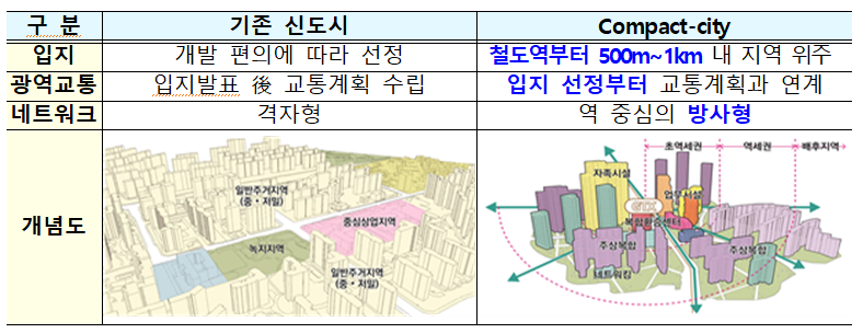 - 철도역 인근에 지정 시 개발밀도를 높이는 Compact-city 컨셉을 적용하는 등 교통 계획과 연계.
