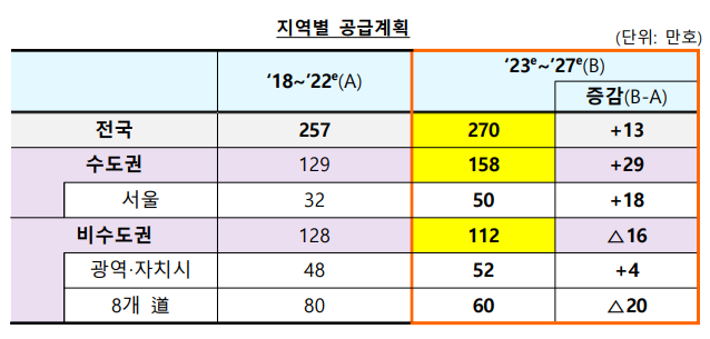 - '23~27년(5년간) 270만호 내외 공급 계획.