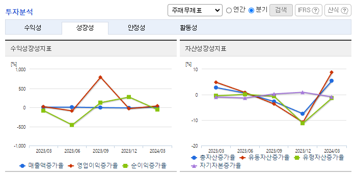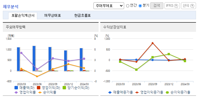 -2023년 12월 전년동기 대비 별도기준 매출액은 0.9% 증가, 영업이익은 25.4% 감소, 당기순이익은 88.5% 감소. 원자재 가격 하락과 중국 경기 부진에 전기차 수요 부진이 겹치며 매출 소폭 확대에도 영업이익과 당기순이익이 감소함. 설비의 안정적 관리와 가동률 증대를 통해 생산성을 올리고 신규 설비투자의 지속 확대로 친환경차 소재용 제품 대응력을 확대해 나갈 계획임.