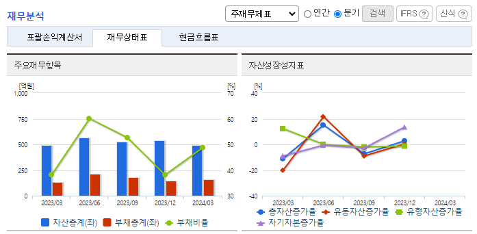-2024년 3월 전년동기 대비 연결기준 매출액은 14.7% 감소, 영업이익 및 당기순이익은 적자지속중임. 영상인식 부분의 감소세로 외형은 축소되었으며, 경상연구개발비등 판관비의 증가로 영업손실의 적자 폭은 크게 확대됨. 인공지능(AI) 기반 솔루션 고도화 작업이 가시적인 성과를 보이고 있으며, 신기술 기반의 솔루션 출시가 본격화되면서 전반적인 원가 요소에 대한 절감 효과가 나타나기 시작함.