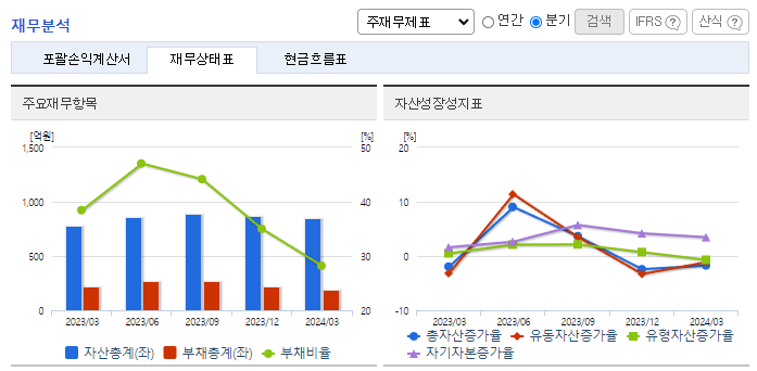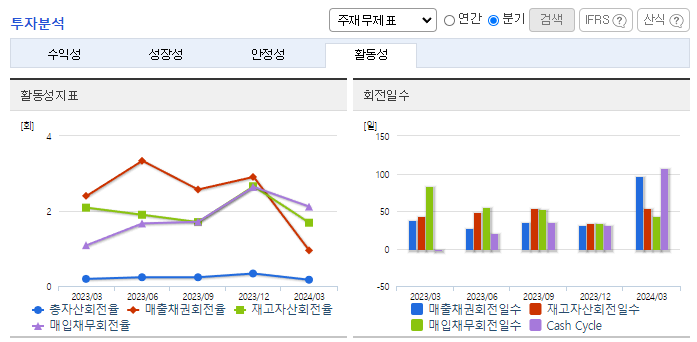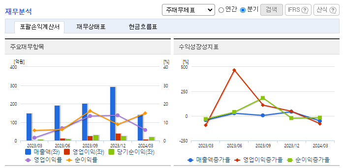 -2024년 3월 전년동기 대비 연결기준 매출액은 5.2% 감소, 영업이익은 258.1% 증가, 당기순이익은 155.9% 증가. 이물검사, 3D CT 검사 등 기존에 없던 검사항목의 증가와 46파이 원통형 및 LFP 배터리와 같은 새로운 폼팩터의 부상으로 검사장비 수요가 늘고 있음. 기술이 안정화된 양산장비 매출 비중 증가로 원가절감 효과가 나타났으며 영업 레버리지 효과로 더 높은 수익성이 기대됨.