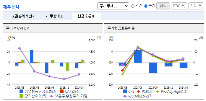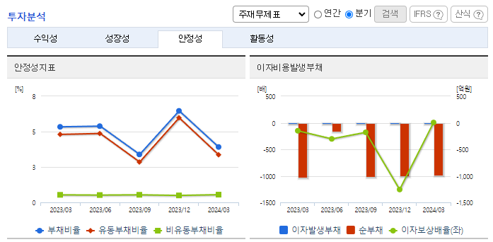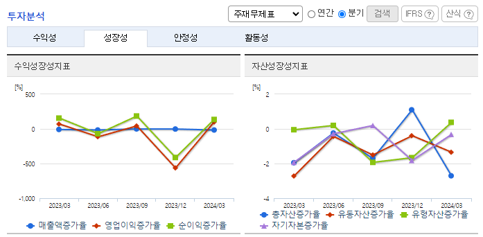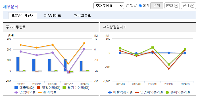 -2024년 3월 전년동기 대비 별도기준 매출액은 30.4% 감소, 영업이익 흑자전환, 당기순이익은 0.2% 증가. 매출액 30% 이상 큰 폭으로 감소하였으나, 용역과 상품 매출원가 측면에서 비용이 크게 절감되어 흑자로 전환함. 매출이 감소한 사유는 금융 IT 부문의 수주 부진임. 수익구조 개선을 위한 사업구조 개편 진행이 마무리 되어감에 따라 수익성이 개선되고 있음.