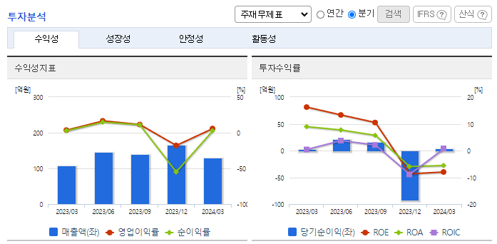 -2023년 12월 전년동기 대비 연결기준 매출액은 21.4% 증가, 영업이익은 82.5% 감소, 당기순이익 적자전환. 매출은 늘었지만 판매비와 관리비, 인건비 등이 전년 대비 크게 늘면서 수익성은 오히려 악화한 상태임. 시장확대 측면에서 피부과용 의료기기 중심 전략에서 치과용, 안과용, 산부인과용 의료기기 영역까지 타 병과로 시장을 확대해 나갈 계획을 갖고 있음.
