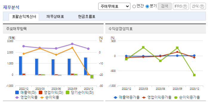 -2023년 9월 전년동기 대비 연결기준 매출액은 18.4% 감소, 영업이익은 64.1% 감소, 당기순이익은 83.1% 감소. 전방산업의 재고조정 현황과 수요 정체에 따라 매출이 감소함. 향후 반도체 시장의 재고 조정이 완료된다면 성장세를 보일 것으로 예상됨. 일본 수출 규제에 따라 반도체 및 디스플레이 제조사들이 차세대 재료에 대해서도 국내 원재료 업체와의 협업을 진행하며 공급망 형성에 신경 쓰고 있음.