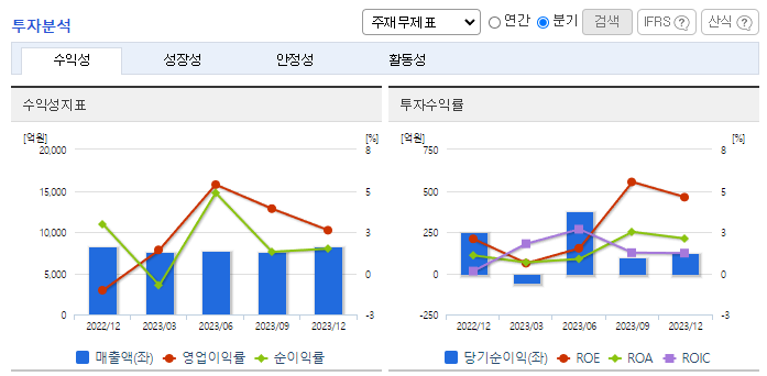 -2023년 12월 전년동기 대비 연결기준 매출액은 3.6% 증가, 영업이익은 3.9% 증가, 당기순이익은 132.9% 증가. 육가공사업부는 계열화와 직영 농장 확대를 통해 돼지 사육두수가 증가하여 매출액은 증가하였으나 사료가격 인상, 질병 및 디팝 등으로 매출원가가 상승하여 영업실적은 감소함. 배합사료 시장은 곡물의 영향도가 높지만 원재료 가격 변동이 판가에 조정이 되므로 마진율은 유지되는 성향이 있어서 수익성은 유지되고 있음.