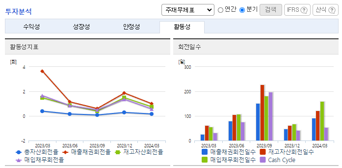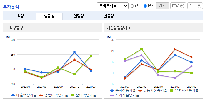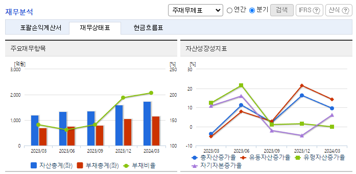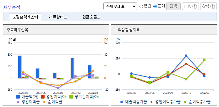 -2024년 3월 전년동기 대비 연결기준 매출액은 43.6% 감소, 영업이익은 65.6% 감소, 당기순이익은 30.4% 감소. 매출액이 감소했지만, 판관비는 25.8% 증가하면서 영업이익에 악영향을 줌. 동사는 매출 증대를 위한 수주물량 확보를 위해 원천기술을 확보하고 차별화된 제품을 생산하여 고객사의 다양한 욕구를 충족시킴으로써 시장 내에서 경쟁력을 확보하고자 함.