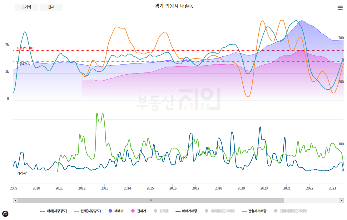 | 의왕시 내손동 시장 강도와 거래량(매매/전세) | 의왕시 포일동 시장 강도와 거래량(매매/전세) |