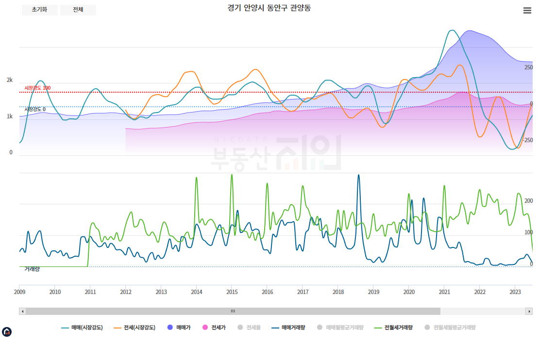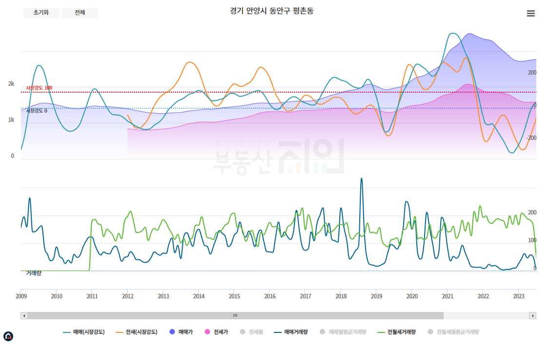 | 안양시 동안구 관양동 시장 강도와 거래량(매매/전세) | 안양시 동안구 평촌동 시장 강도와 거래량(매매/전세) |