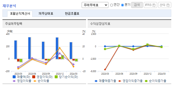 -2024년 3월 전년동기 대비 연결기준 매출액은 9.3% 감소, 영업손실은 38.4% 감소, 당기순손실은 27.7% 감소. 동사는 소비심리 위축에 따른 영향으로 2024년 1분기 매출은 전년대비 9% 가까이 감소했으나, 비용 절감 실현으로 영업손실폭 감소. 적극적인 스타마케팅 활동 및 매체를 통한 광고활동을 통한 브랜드력을 강화하고, 이월상품을 판매하는 직영 갤러리를 운영하여 판매 극대화에 노력.