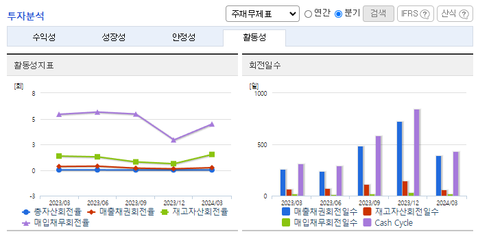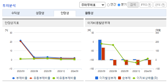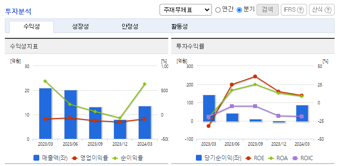 -2024년 3월 전년동기 대비 별도기준 매출액은 27.6% 감소, 영업손실은 30.1% 감소, 당기순이익은 40.1% 감소. 2023사업연도 감사의견이 '의견거절'로 동사 주권이 상장폐지기준(유가증권시장 상장규정 제48조)에 해당됨을 공시하였음. 동사는 주권 상장폐지에 대한 이의신청서를 제출하였으며, 한국거래소는 2024년 10월 31일까지 개선기간을 부여하기로 결정하였음.