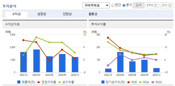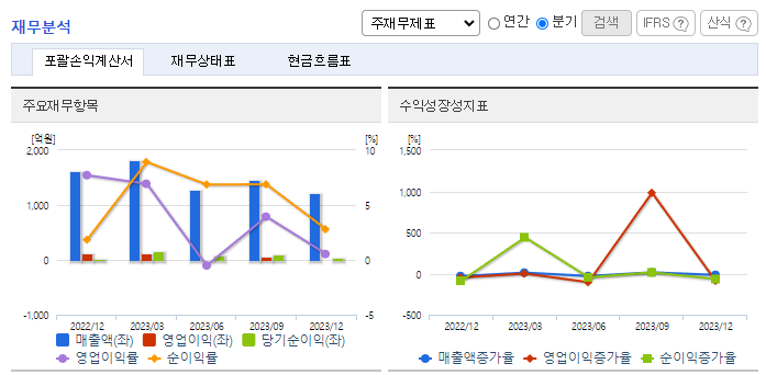 -2023년 9월 전년동기 대비 연결기준 매출액은 51.4% 감소, 영업이익은 86.3% 감소, 당기순이익은 74.8% 감소. 휴대폰용 내외장재, 안테나/차폐부품 및 휴대폰 관련 사출제작용 금형 매출이 급감했으며 특히 금형 매출은 전년대비 4% 수준에 그침. 외형 축소로 손익도 대폭 감소함. 신사업으로 연료 전지 발전 사업을 영위하는 아이티에너지의 지분을 '21.12에 취득을 하였으며, '22.1분기부터 연결종속 법인으로 편입함.