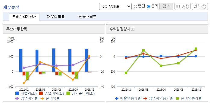 -2023년 9월 전년동기 대비 연결기준 매출액은 7.4% 감소, 영업손실은 1.5% 증가, 당기순손실은 8.3% 감소. 2023년 3분기 기준 매출액의 약 18.9%인 84,144백만원의 연구개발비용을 지출하고 있으며, 안질환 치료제, 당뇨병 치료제 등 신약개발을 위해 노력 중임. 지난해 코로나신속항원검사키트 매출로 인한 기저효과 발생과, 헬스케어 품목 매출감소로 전년동기대비 매출이 줄었으나, 원가 및 비용 절감으로 순손실폭을 축소함.