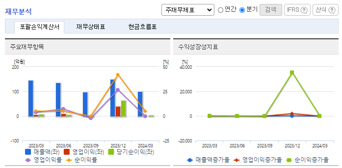 -2024년 3월 전년동기 대비 연결기준 매출액은 31.8% 감소, 영업이익 적자전환, 당기순이익은 65.4% 증가. 전년동기 대비 매출액이 크게 감소하였으며, 매출원가는 소폭 감소함. 이에 따라 영업이익 및 당기순이익은 적자로 전환함. 현대중공업그룹과의 거래를 바탕으로 안정적인 수익 창출 중이며, 글로벌 환경규제 강화추세로 환경설비 장비 시장의 점진적인 성장 기대.