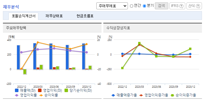 -2023년 12월 전년동기 대비 연결기준 매출액은 6.5% 증가, 영업이익은 67.5% 증가, 당기순이익 흑자전환. 화장품의 엔데믹 기조 정착 후 야외활동 확대 및 K-뷰티 인기 등으로 수출이 증가하며 전체 외형 성장을 견인함. 2024년 역시 글로벌 온라인 플랫폼 중심으로 미국, 동남아 등 다변화가 이루어져 수출은 증가할 것으로 예상. 비건 및 클린뷰티 등에 대한 관심 증가에 따라 동사 '체이싱래빗' 브랜드 마케팅 노력 중.