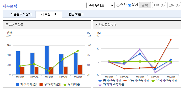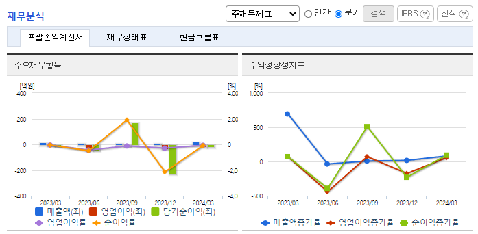 -2024년 3월 전년동기 대비 별도기준 매출액은 41.1% 증가, 영업손실은 94.5% 증가, 당기순손실은 95.2% 증가. 동사는 헬스케어, 미용, 생활용품 등으로 사업을 확장했지만, 이렇다 할 성과를 거두지 못했음. 최근 5년 실적은 2020년을 제외하면 모두 적자를 기록함. 온라인 채널은 종합몰, 오픈마켓, 소셜커머스, V커머스 등 40여 채널 제휴를 통해 향후 온라인 매출 확대의 기반을 마련하여 매출 성장이 기대됨.