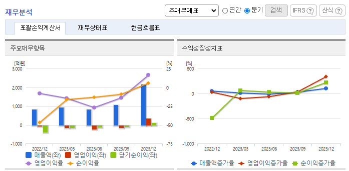 -2023년 9월 전년동기 대비 연결기준 매출액은 37.9% 증가, 영업손실은 977.3% 증가, 당기순이익 적자전환. 북미향 고객에 신규로 OIS를 공급해 4분기 최대 매출을 예상함. 3분기 영업적자 지속은 액츄에이터 생산능력 확대와 관련 인건비 등 고정 비용이 증가했기 때문임. 2024년 삼성전자와 중화권 스마트폰 업체 및 북미 거래선을 동시에 확보, 시장 성장을 반영하면 추가 매출도 가능하며, 최대 매출이 예상됨.