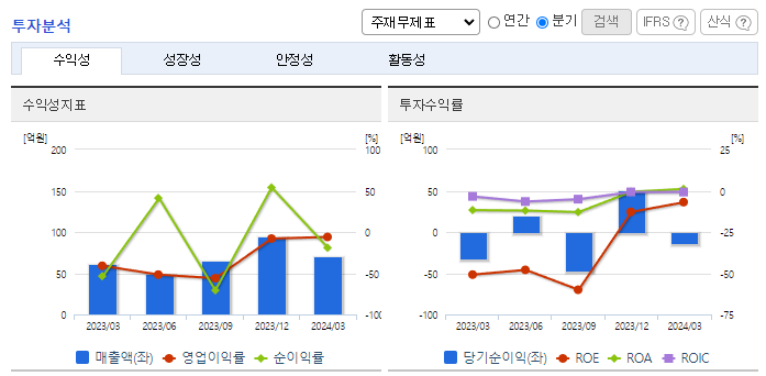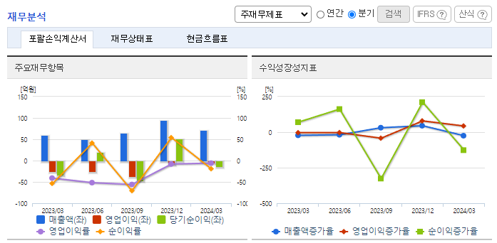-2024년 3월 전년동기 대비 연결기준 매출액은 17.1% 증가, 영업손실은 82.9% 감소, 당기순손실은 49.2% 감소. 매출액 상승에도 매출원가와 판관비가 7.1%, 16.7% 감소하면서 영업이익에 긍정적인 영향을 줌. 현재 사업영역은 산업용 효소와 특수용 효소이며, 현재 개발 중인 신약후보물질의 임상 단계가 진행됨에 따라 치료용 효소시장에 진입할 계획임.