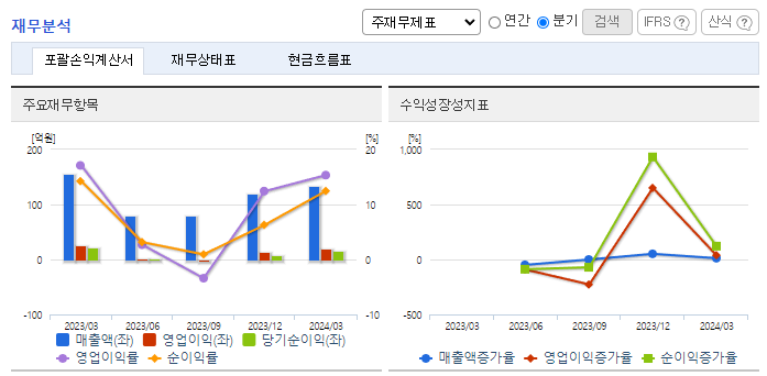 -2024년 3월 전년동기 대비 연결기준 매출액은 13.9% 감소, 영업이익은 22.7% 감소, 당기순이익은 0.8% 감소. 특수가스 제조기술의 국산화 목적으로 우크라이나 Cryion 사와 합작투자법인을 설립하였으며, 반도체용 프리커서 신제품 개발 및 해외 M/S 확보를 위해 유피케미칼과 합작투자법인을 설립하였음. 전방 산업인 반도체 및 디스플레이 시장의 침체 속에 전년동기 대비 매출과 영업이익이 감소함.
