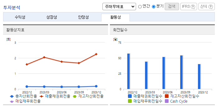 -2023년 9월 전년동기 대비 연결기준 매출액은 15% 감소, 영업이익은 135.6% 증가, 당기순이익은 33.1% 증가. 한국에서의 매출이 전분기 대비 약 50%가량 감소하였음. 하지만 판관비 감소여파에 따라 영업이익이 전년도 대비해서 135% 상승함. 동북아 아시아 지역 중 성장잠재력이 있다고 판단되는 국가(또는 지역)들을 우선적으로 선별하여 시장 진출을 준비하고 있음.