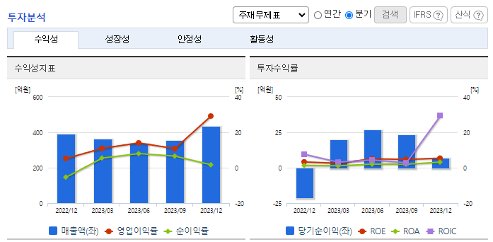 -2023년 9월 전년동기 대비 연결기준 매출액은 15% 감소, 영업이익은 135.6% 증가, 당기순이익은 33.1% 증가. 한국에서의 매출이 전분기 대비 약 50%가량 감소하였음. 하지만 판관비 감소여파에 따라 영업이익이 전년도 대비해서 135% 상승함. 동북아 아시아 지역 중 성장잠재력이 있다고 판단되는 국가(또는 지역)들을 우선적으로 선별하여 시장 진출을 준비하고 있음.