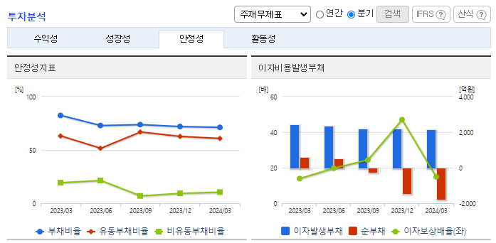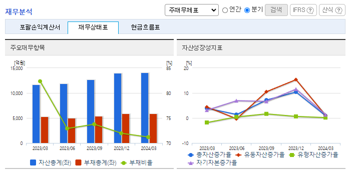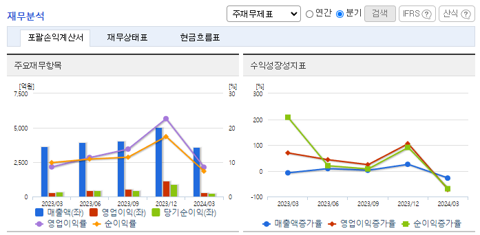 -2024년 3월 전년동기 대비 연결기준 매출액은 1% 감소, 영업이익은 2.1% 감소, 당기순이익은 28.7% 감소. 텔미누보, 타크로벨 등 기존제품과 엑시글루에스정, 루센비에스주 등 신제품이 꾸준한 매출을 일으키고 있으나 인건비 증가로 수익률은 소폭 감소 되었음. 2023년 11월 글로벌제약사 노바티스사와 약 1조 7천억 규모의 연구, 임상개발 및 상업화 권리에 대한 기술수출 계약을 체결한 바 있음.