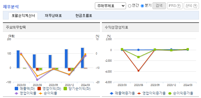 -2024년 3월 전년동기 대비 연결기준 매출액은 13.9% 증가, 영업손실은 465.1% 증가, 당기순손실은 15.5% 감소. B2B영업 강화를 통해 기업 간 PC공급의 매출 비중을 높이며 매출의 다각화를 진행하고 있어, 향후 높은 성장을 유지할 것으로 예상됨. 충전기, 키보드 등 제품들의 출시를 진행 중이며, 뷰소닉, 로지텍 등 파트너십 체결을 통한 PC 주변기기 판매에도 사업을 확장하여 신제품 출시와 동시에 홍보에도 주력하고 있음.