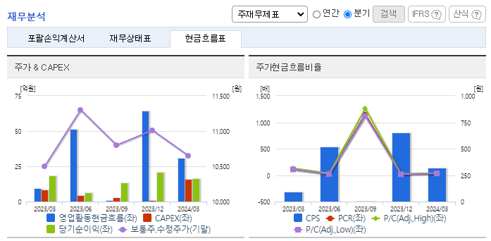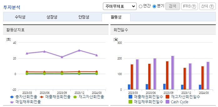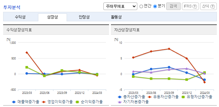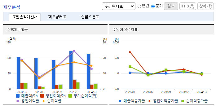 -2024년 3월 전년동기 대비 별도기준 매출액은 11.4% 증가, 영업이익은 22.9% 감소, 당기순이익은 9.1% 감소. 시장 수요 확대에 따라 매출은 안정적으로 증가하고 있으나 대부분의 원료를 수입에 의존함에 따라 비용이 크게 증가하여 수익성이 하락하였음. 최근 적극적인 신규 시장개척 활동으로 동남아 외에도 남미, 중국, 중동, 아프리카 등의 지역으로 판로를 넓혀가고 있음.